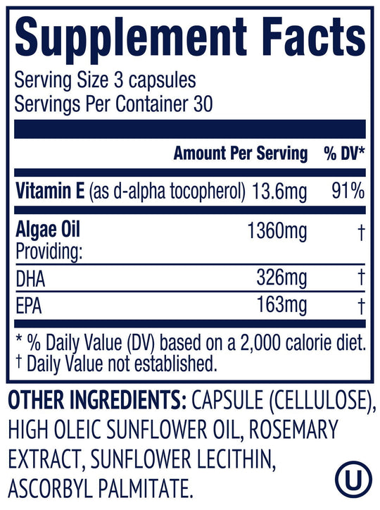 Ingredients: D-Alpha Tocopherol, Algae Oil, Capsule (Cellulose), High Oleic Sunflower Oil, Rosemary Extract, Sunflower Lecithin, Ascorbyl Palmitate